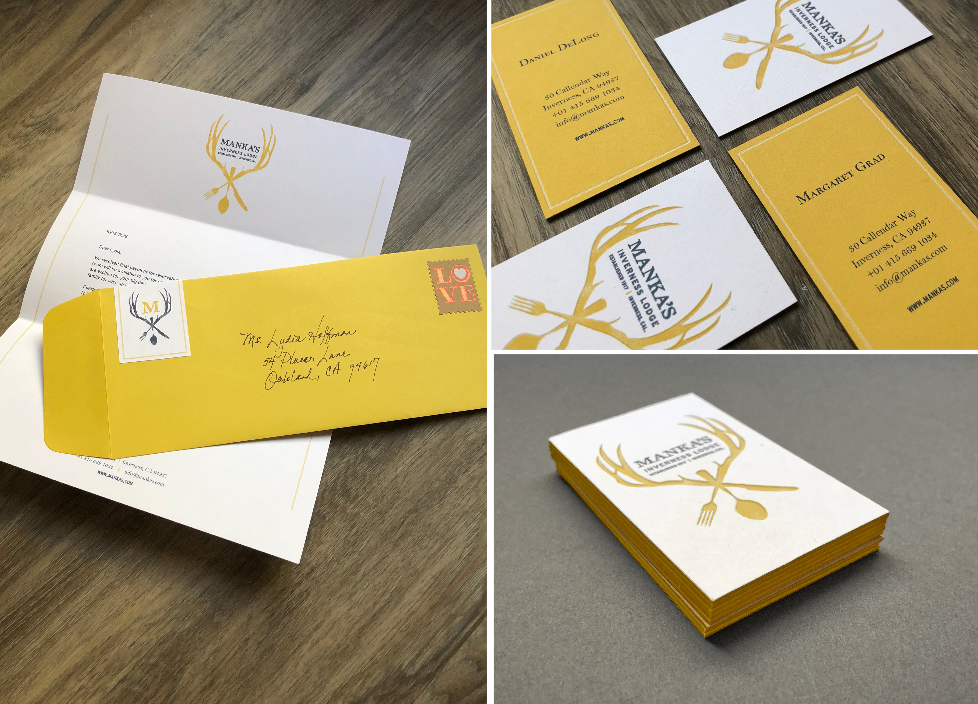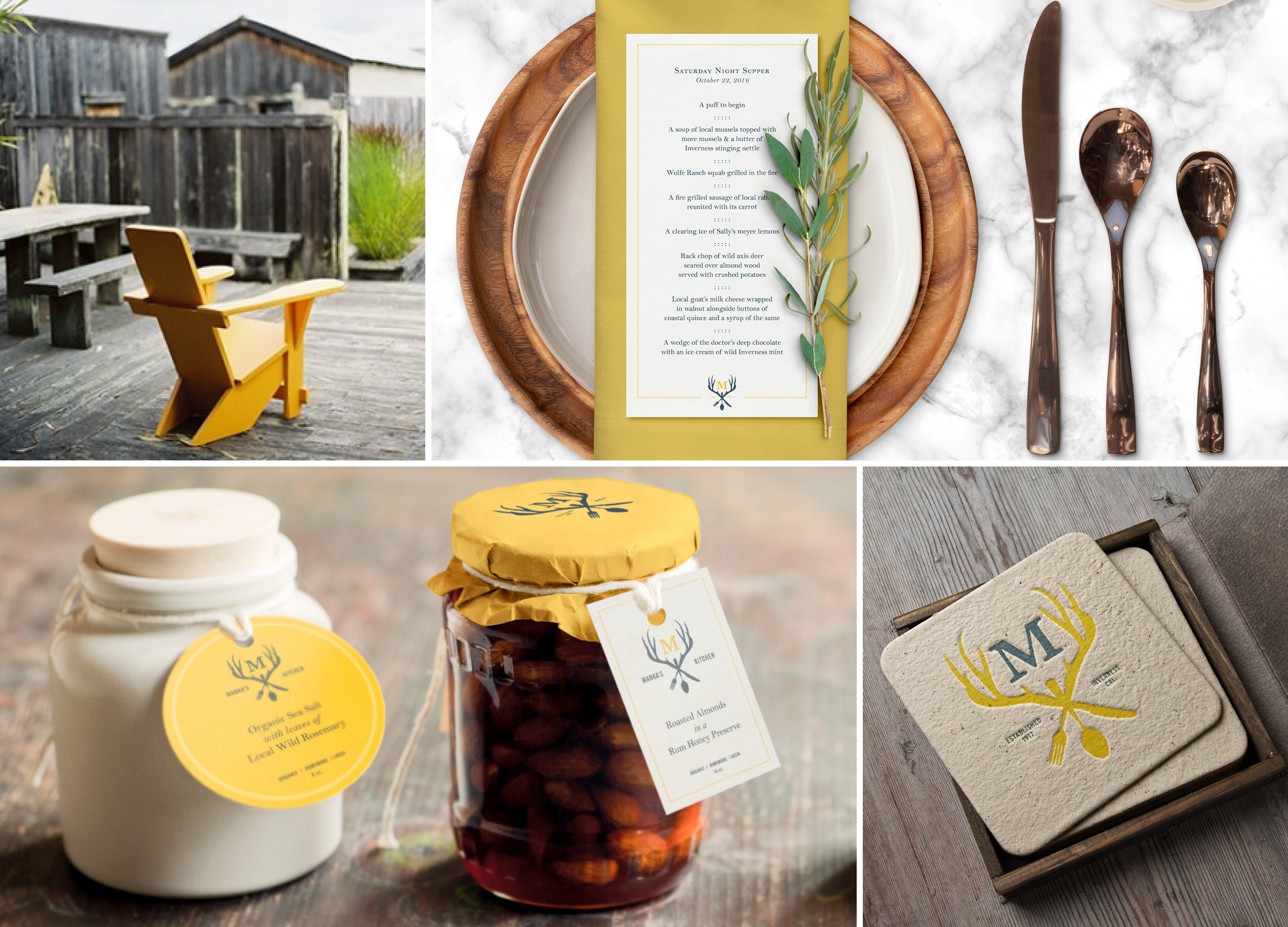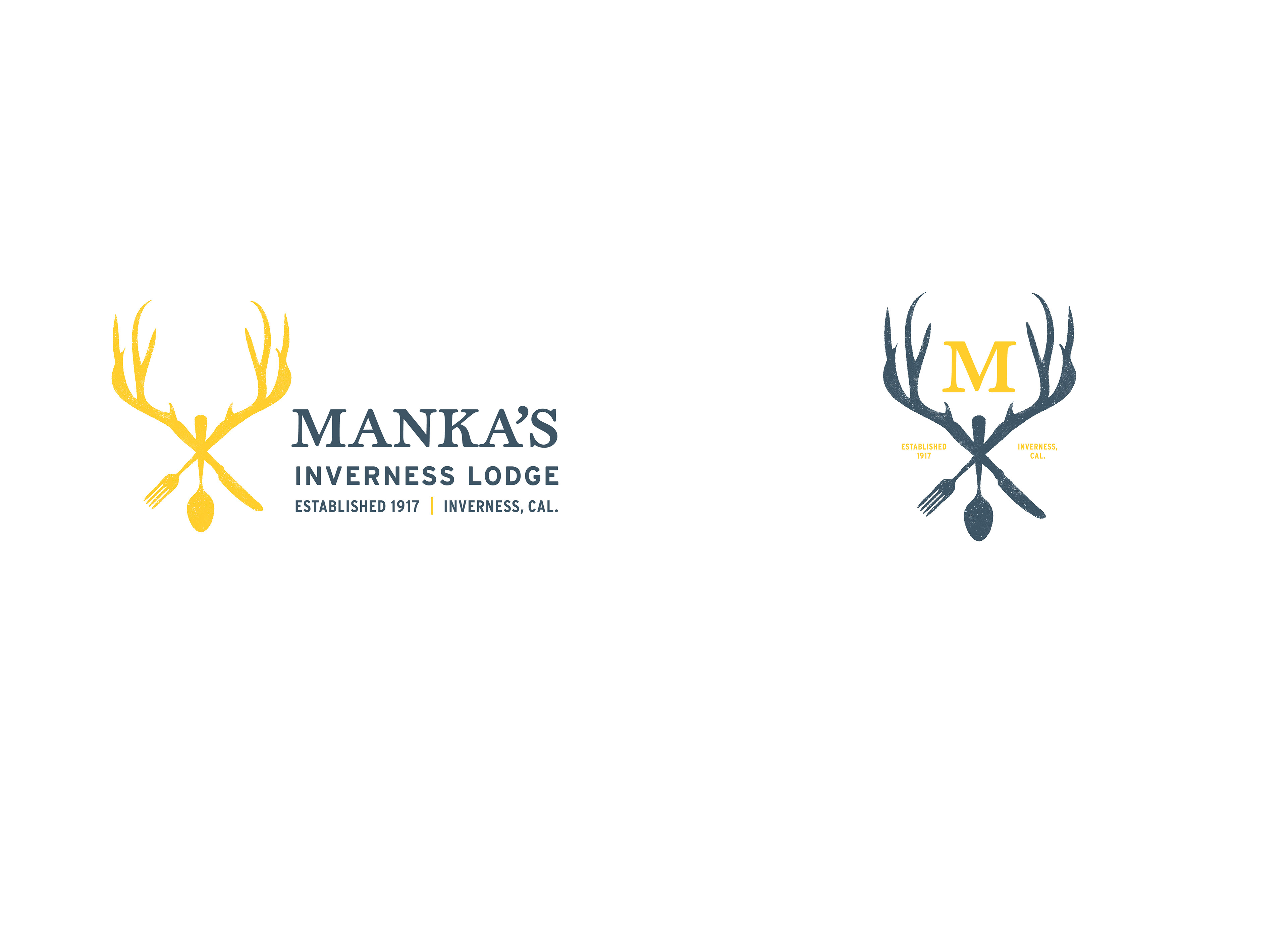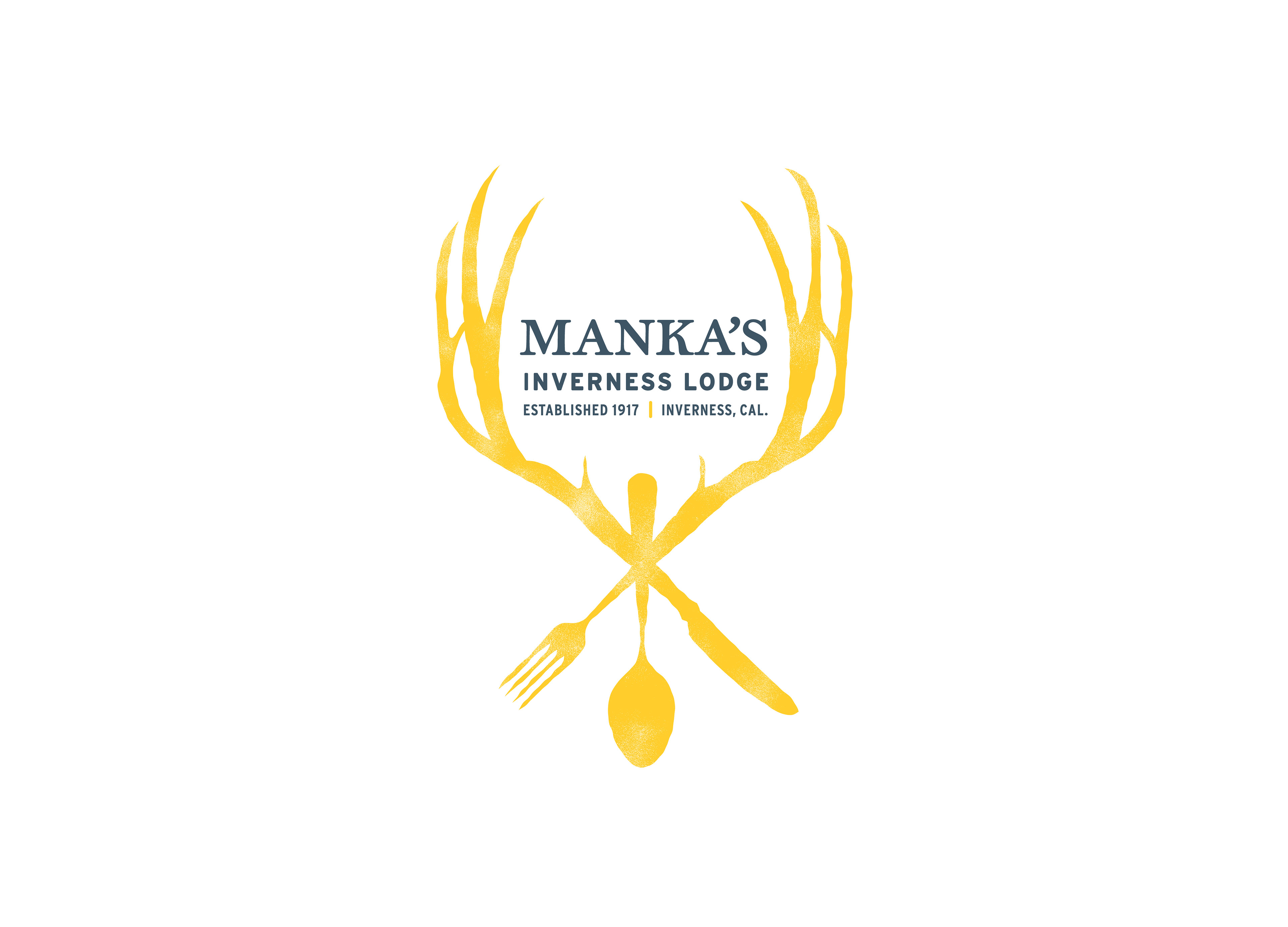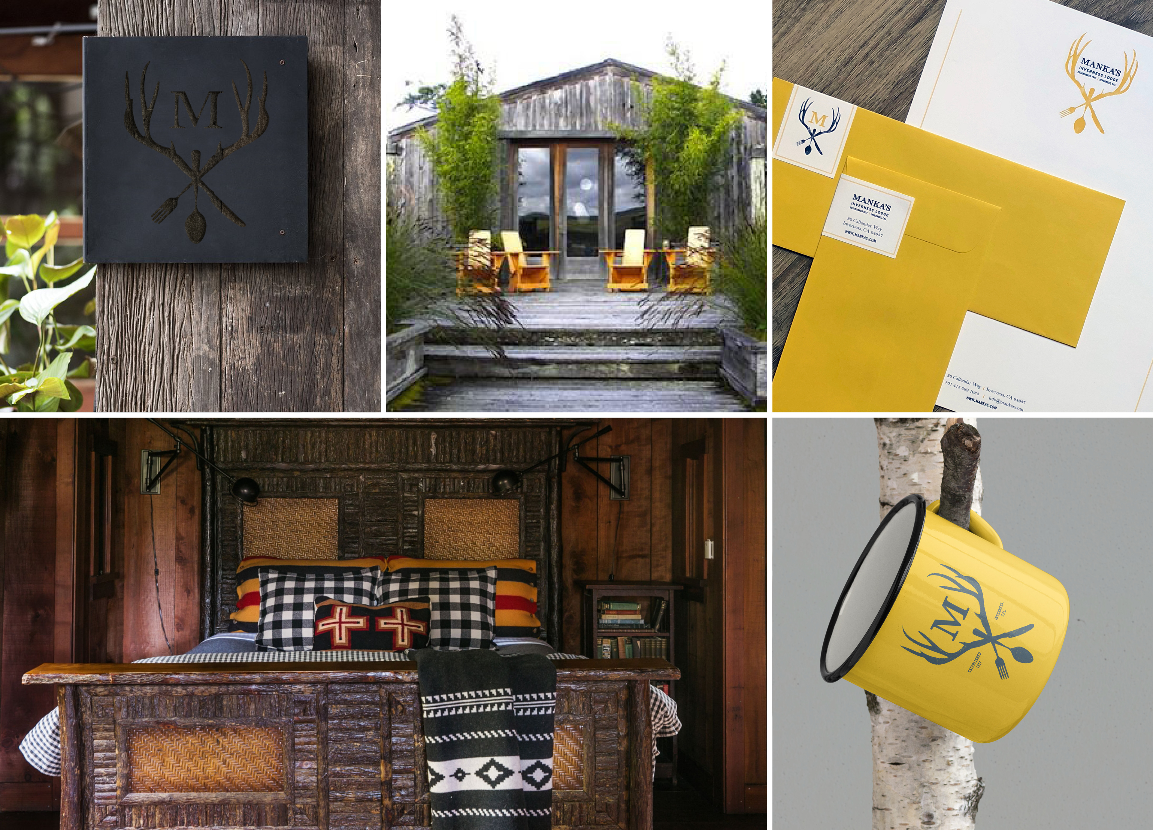 This eclectic, hidden-away inn is located in Inverness, California. The look of the inn mixes touches of modern with the retro look of the establishment from the past 90 years—the original collection of mounted antlers, as well as taxidermy specimens of local wildlife are displayed throughout the cottages and main cabin. The logo communicates the lodging and dining experience intertwined in rustic elegance. It doesn't take itself too seriously, and the imagery and color palette present just enough playfulness and quirkiness. The golden yellow is a favorite color of the proprietors, and touches of it can be seen in the Adirondack chairs, the bedroom furnishings, and other elements throughout the lodge.