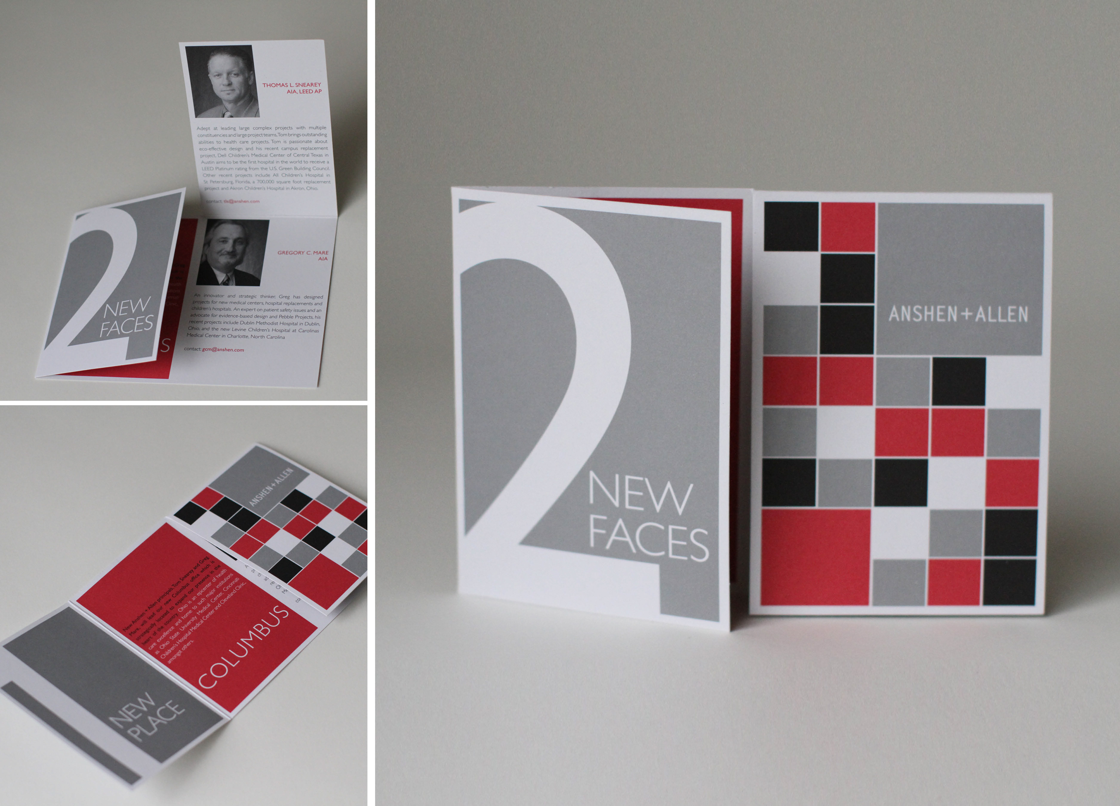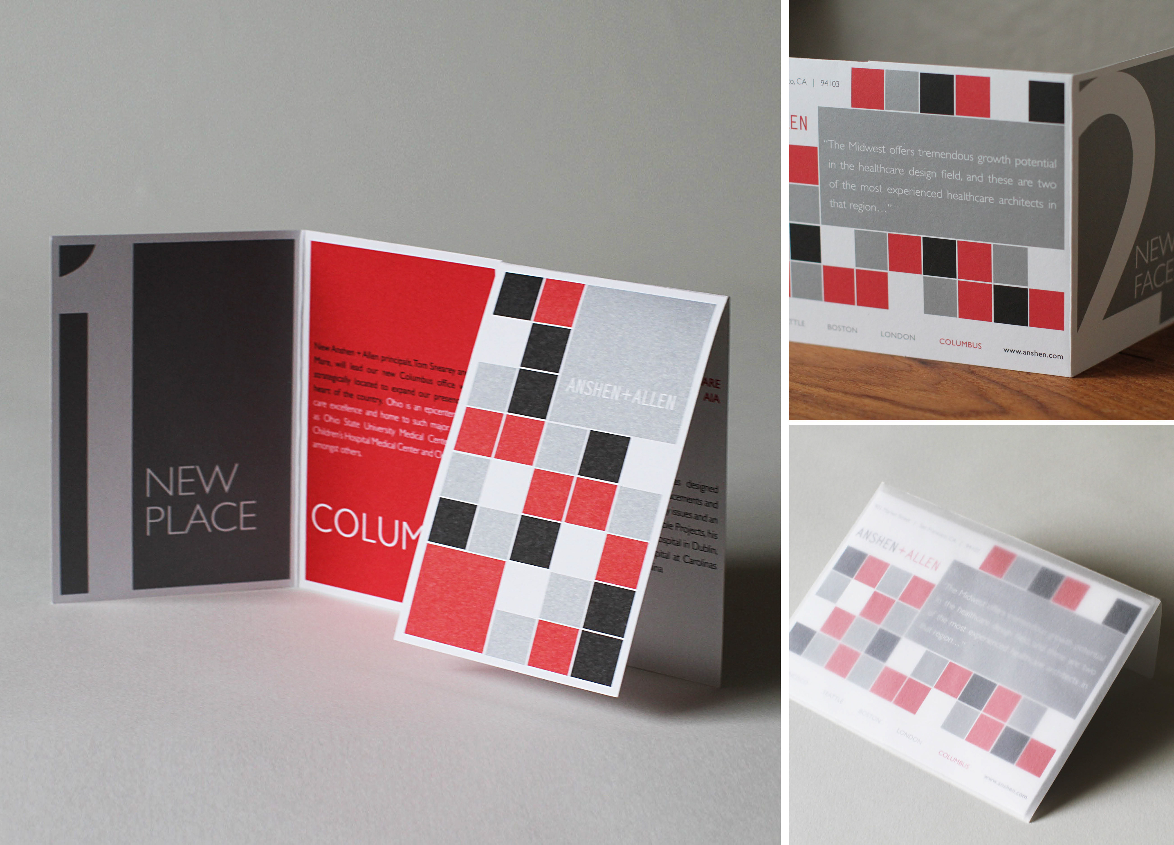 Unique folding announcement complements the numbered elements in the text; squares are part of the company's branding.