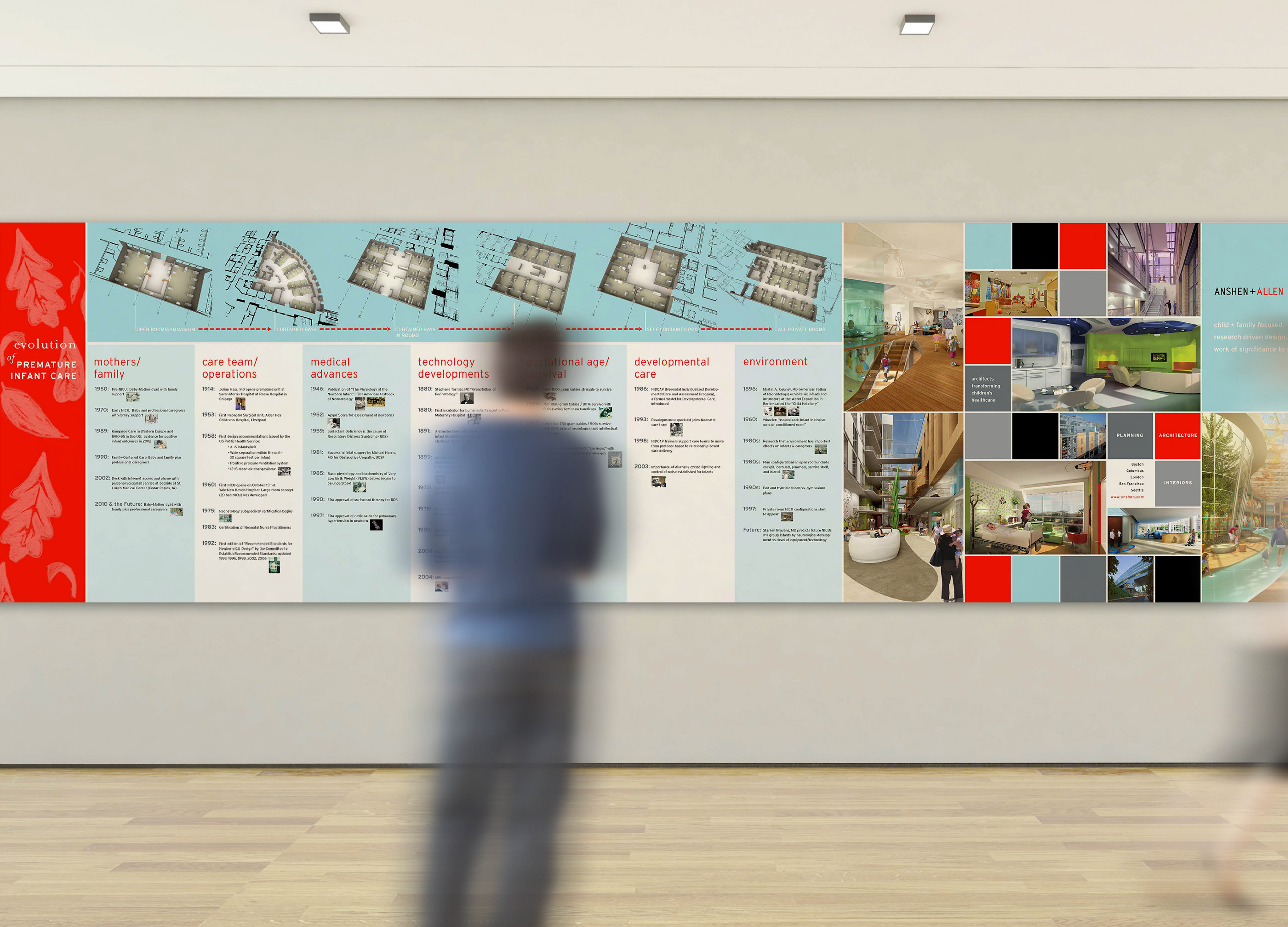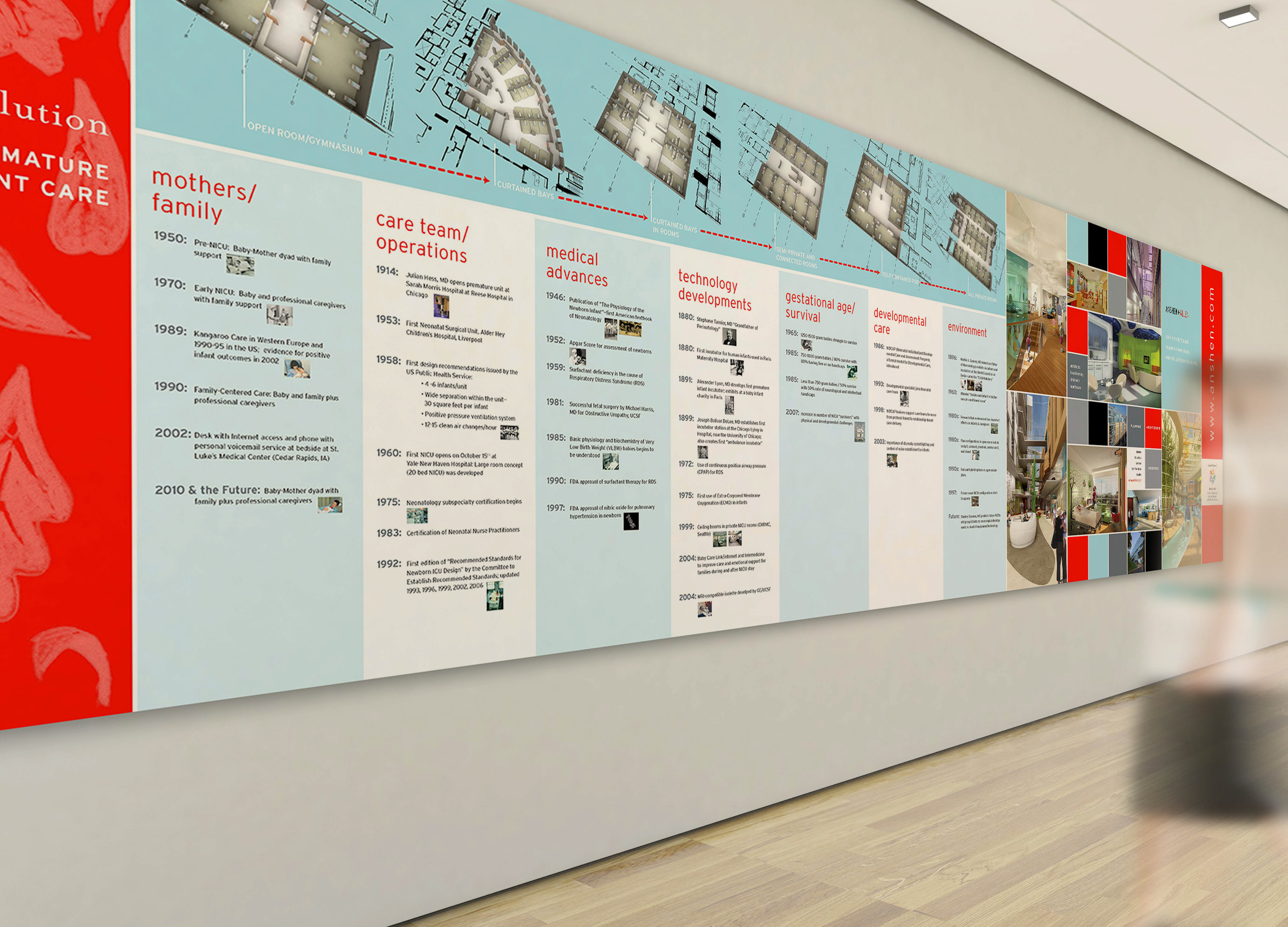 Exhibit wall detailing history of pre-natal hospital spaces. Squares and colors were part of the company's VI.