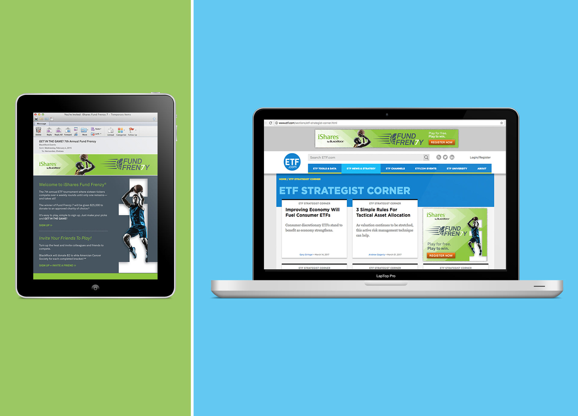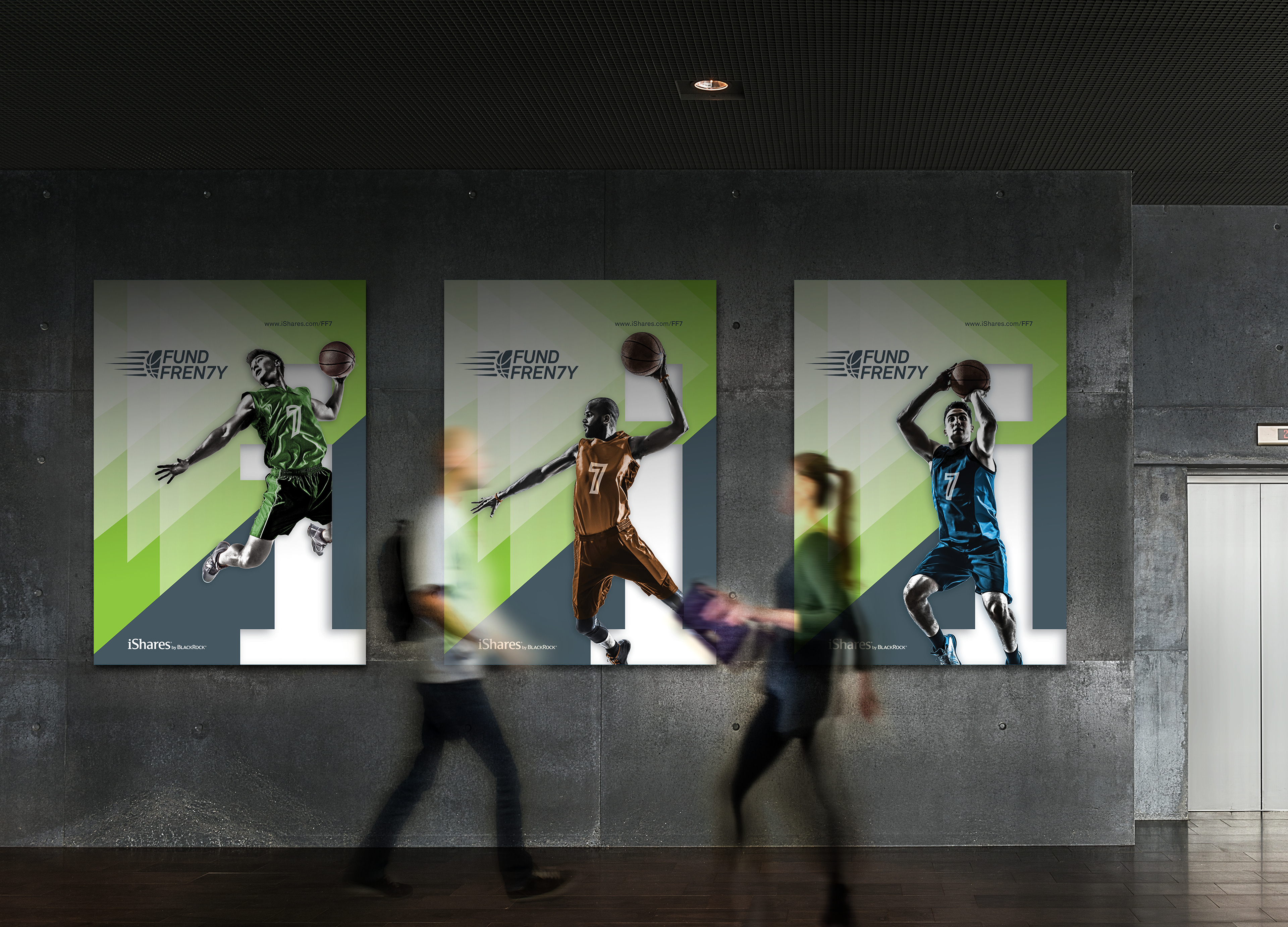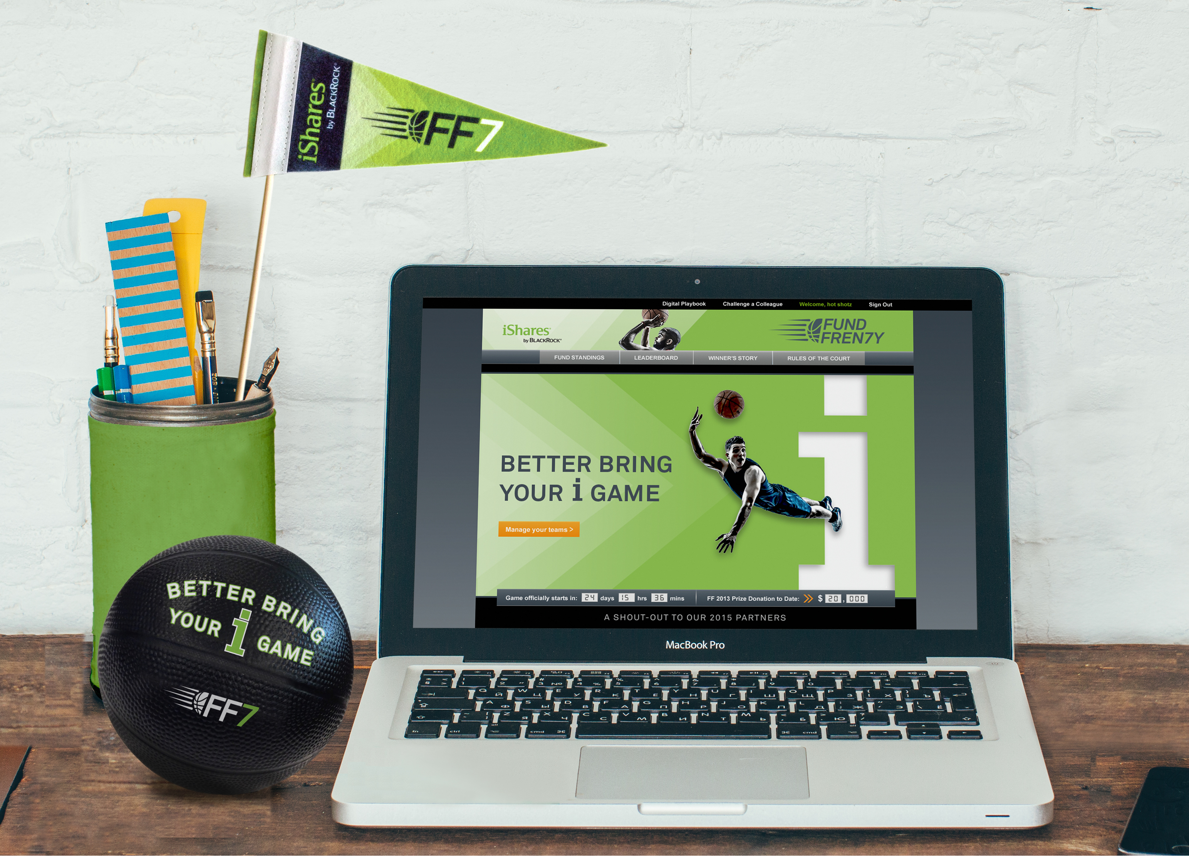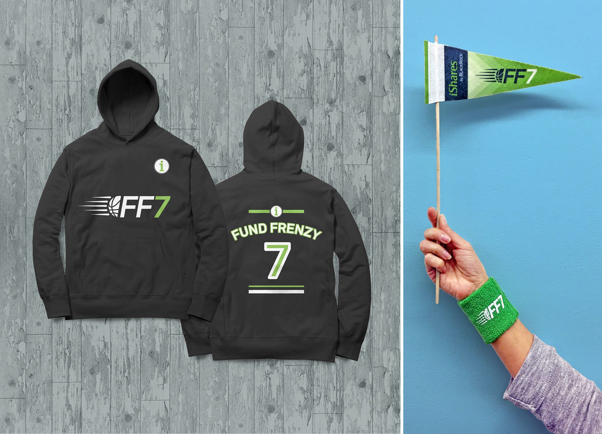 I presented three proposed logos for the event. Criteria for the event identity were to include event name, Fund Frenzy, set in Akkurat Pro; the number 7, for the seventh annual event; and, basketball related symbology. The third option to the right, with the tiles, represent the "Sweet 16" tickers or funds in the game.