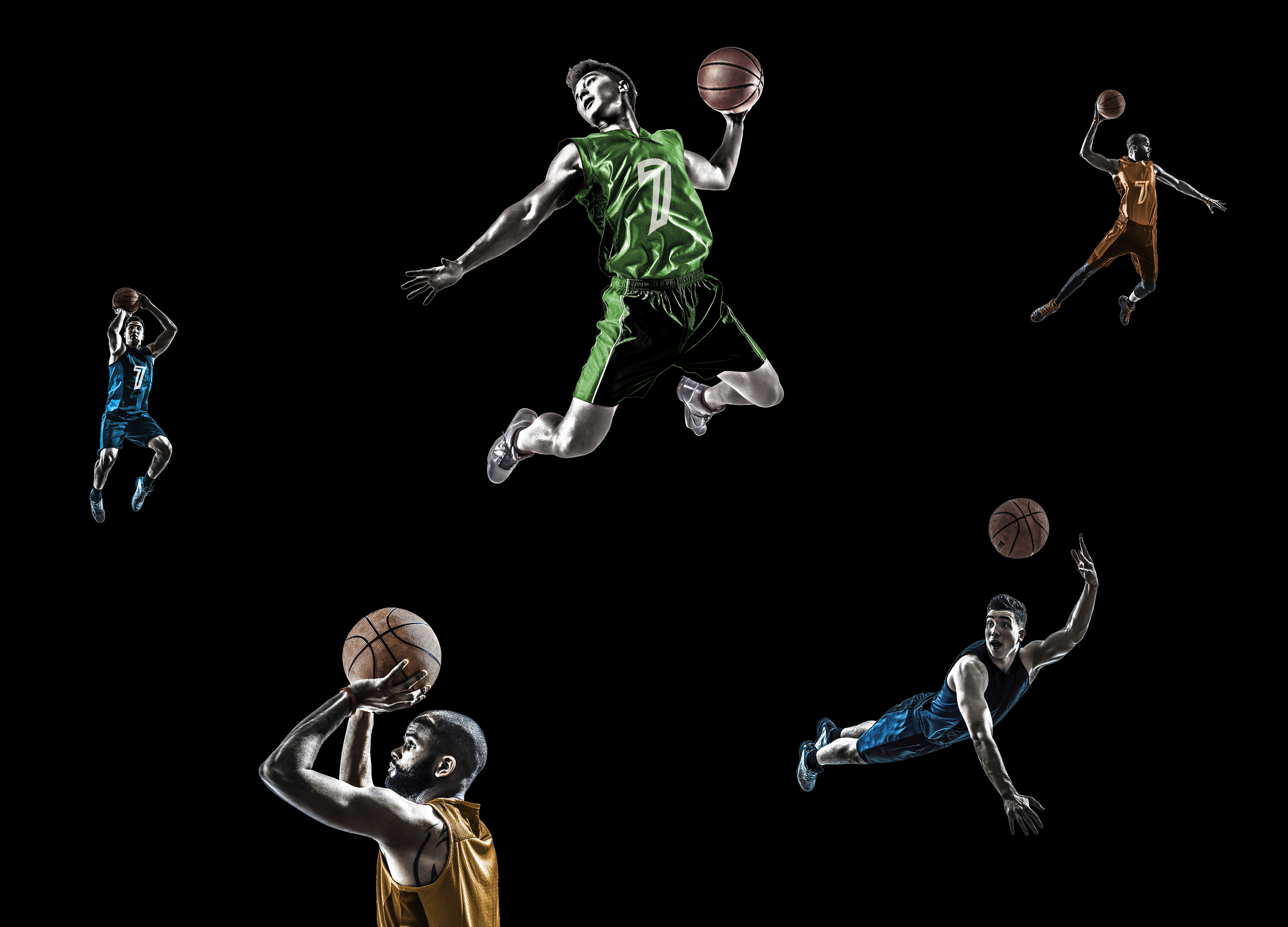 Inspired by the high-energy photography of Nike sport ads, I created a team of diverse basketball players to add human interest and engagement to the look of the event. These players were used in layouts throughout the campaign. The colors of their jerseys relate to the color coding of the four sets of funds in the brackets. The number 7 is for the seventh annual Fund Frenzy.