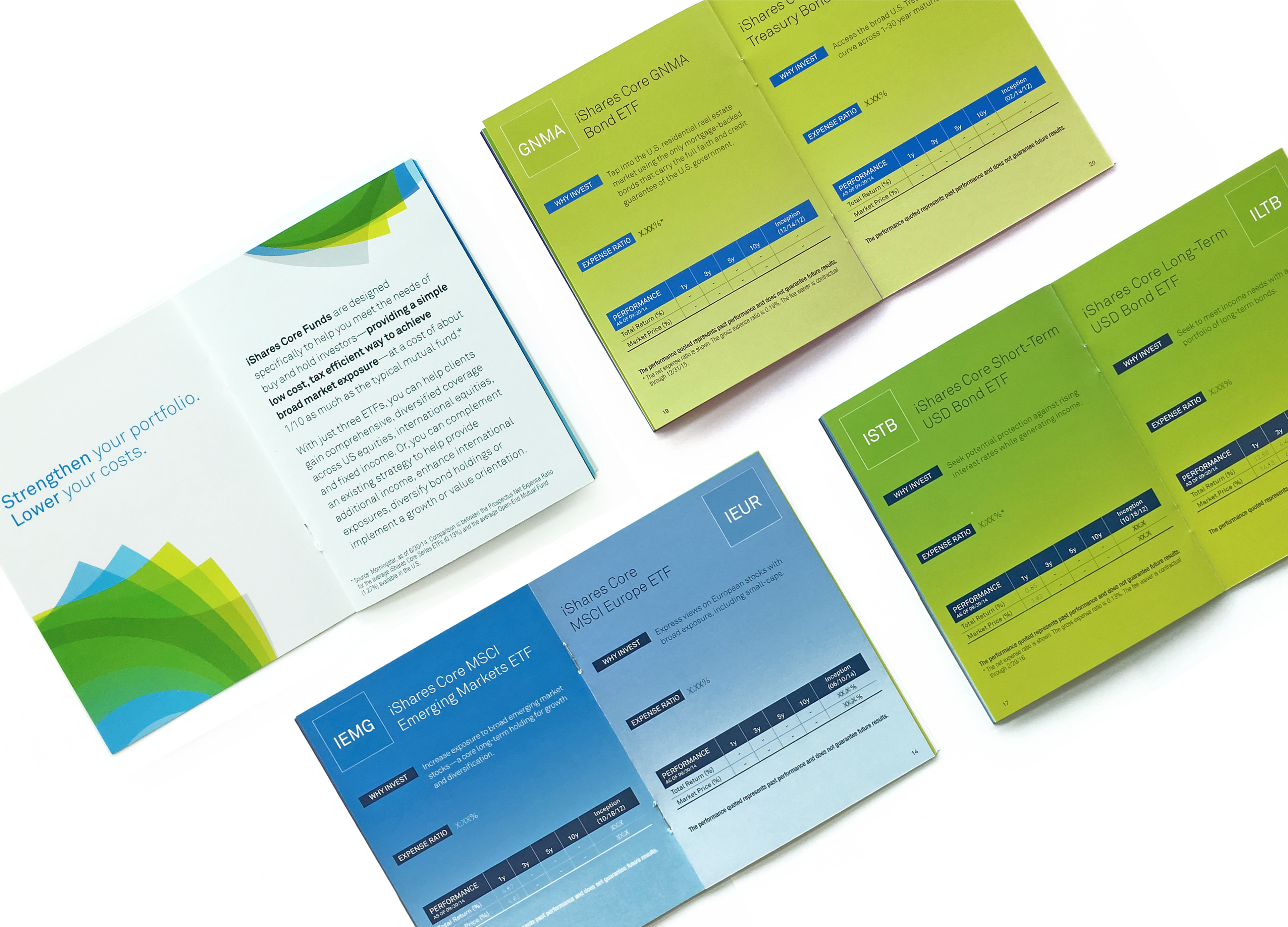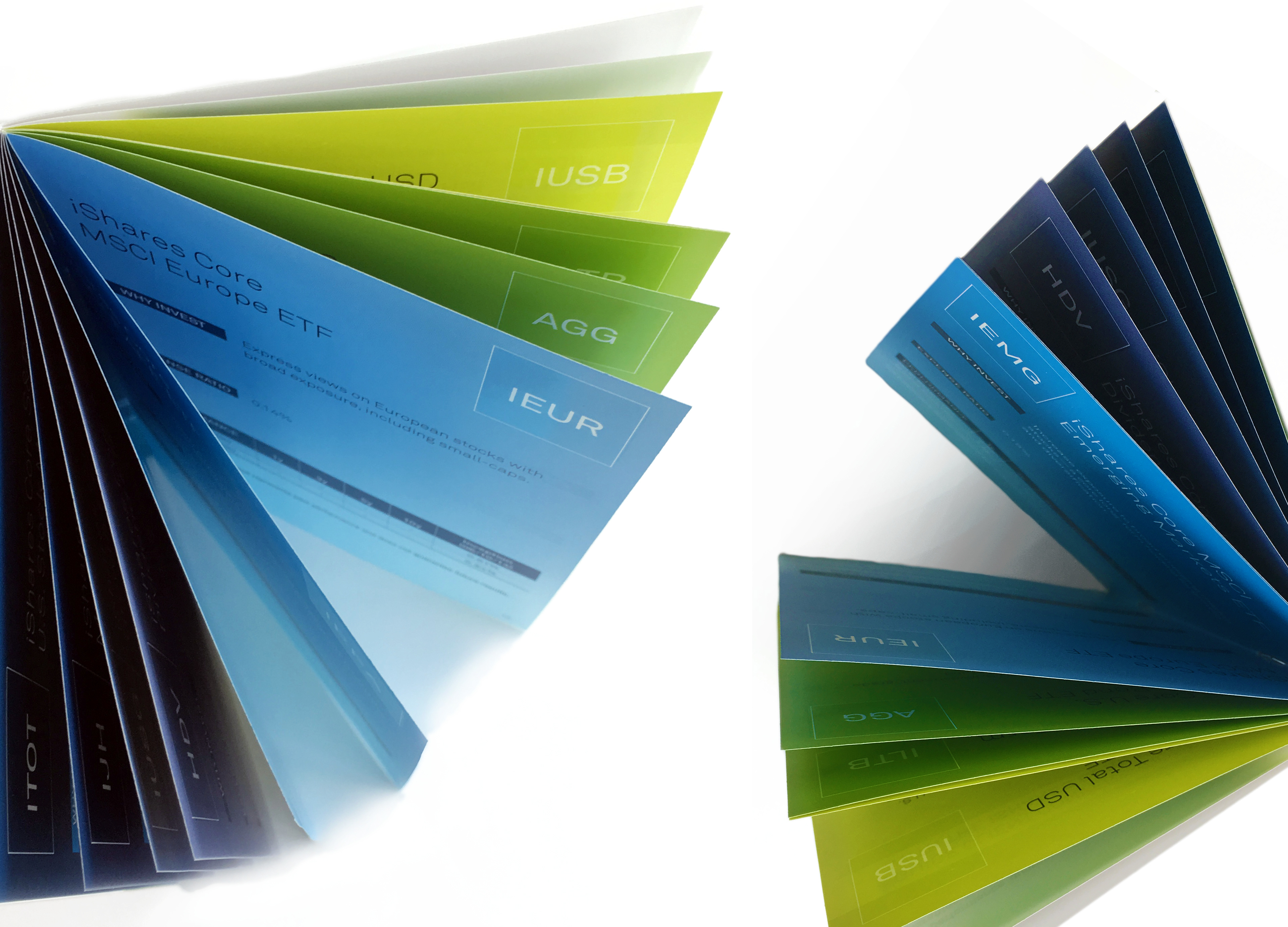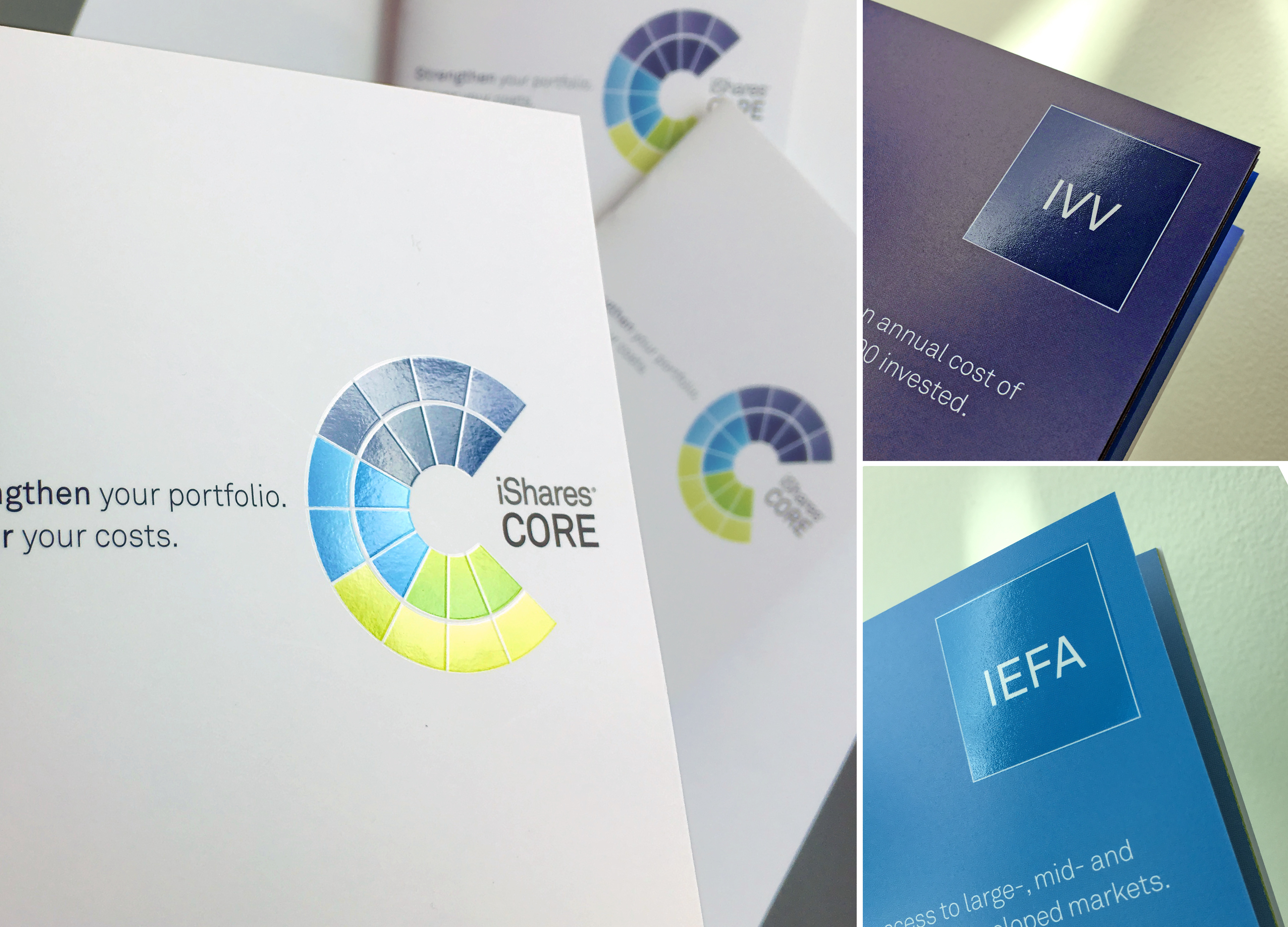This guide was used in multiple direct mail campaigns as a quick reference for the iShares core products. The guide stood out from other client materials due to its 4.5” x 6” size and the key information was enhanced by the design, which made it fun and easy to navigate.